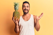 Młody latynoski mężczyzna trzymający ananasa przerażony i zdumiony otwartymi ustami dla zaskoczenia, niedowierzanie twarz