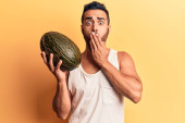 Zdjęcie "Młody latynoski mężczyzna trzymający ananasa przerażony i zdumiony otwartymi ustami dla zaskoczenia, niedowierzanie twarz " może być wykorzystywane do celów osobistych i komercyjnych zgodnie z warunkami zakupionej licencji Royalty-free. Obraz jest dostępny do pobrania w jakości wysokiej rozdzielczości do 5760x3840.