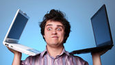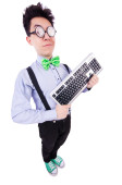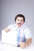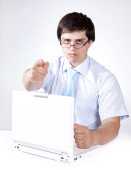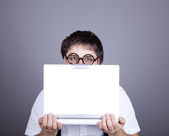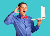 mężczyźni w pończoch z muszką i utrzymanie notebook okulary.