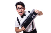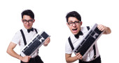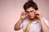 mężczyźni w pończoch z muszką i utrzymanie notebook okulary.