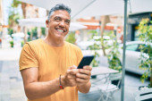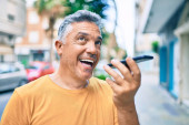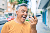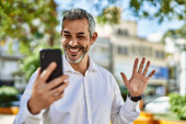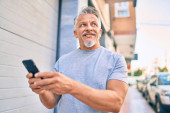 Zdjęcie "Łysy mężczyzna w średnim wieku uśmiecha się szczęśliwy wykonując rozmowy wideo za pomocą smartfona w mieście." może być wykorzystywane do celów osobistych i komercyjnych zgodnie z warunkami zakupionej licencji Royalty-free. Obraz jest dostępny do pobrania w jakości wysokiej rozdzielczości do 5760x3840.