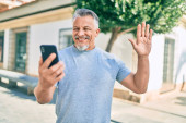 Łysy mężczyzna w średnim wieku uśmiecha się szczęśliwy wykonując rozmowy wideo za pomocą smartfona w mieście.