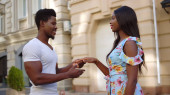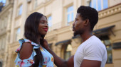 Cute afro para wykonując taniec latynoski w mieście. Mężczyzna i kobieta tańczące bachata