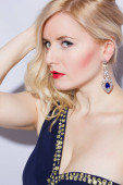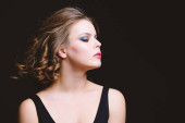 portret pięknej młodej kobiety blondynka gotuje z jasnego makijażu. dziewczyna ubrana w czarny strój wieczorowy, na czarnym tle.