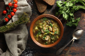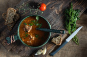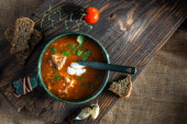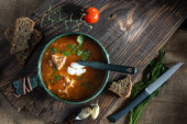 Czerwona zupa z pomidorami i ziołami. Chleb i czosnek na zupę. Góra.