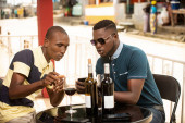 Zdjęcie "Młody człowiek siedzi w barze trzymając głowę przed sobą na stole butelkę czerwonego wina i dwa kieliszki w okularach." może być wykorzystywane do celów osobistych i komercyjnych zgodnie z warunkami zakupionej licencji Royalty-free. Obraz jest dostępny do pobrania w jakości wysokiej rozdzielczości do 5760x3840.