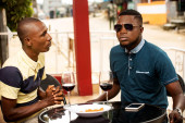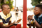 Młody człowiek siedzi w barze trzymając głowę przed sobą na stole butelkę czerwonego wina i dwa kieliszki w okularach.