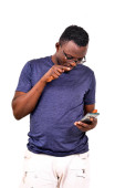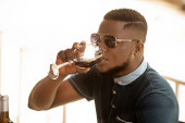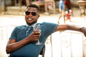 młody Afrykanin korzystający z telefonu komórkowego podczas siedzenia w barze - człowiek patrząc na nowe aplikacje smartfona do mediów społecznościowych przed nim kieliszek wina