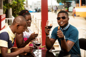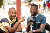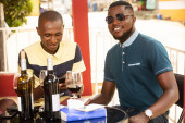 Dwóch młodych Afrykanów delektujących się winem w restauracji. Degustacja elitarnych napojów. Weryfikacja smaku, koloru, osadu wina. Szczęśliwy człowiek.