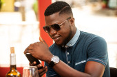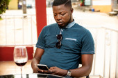 przystojny młody Afrykanin człowiek stoi trzymając szklankę czerwonego wina i obsługi jego telefon komórkowy