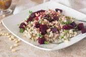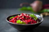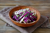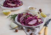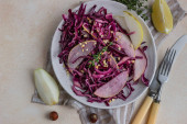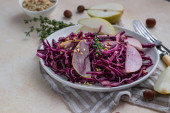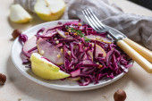 Czerwona kapusta, sałatka z gruszek i orzechów laskowych z sosem cytrynowym i oliwą z oliwek. Lekkie kamienne tło. Wegetariańskie jedzenie. Skupienie selektywne.