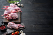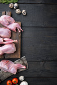 Przepiórka surowego mięsa gotowa do gotowania, płaska, na czarnym drewnianym tle z miejscem na tekst