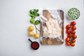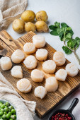 Przysmaki morskie, przegrzebki z ziemniakiem, groszkiem zielonym i miętą, widok z góry, na białym tle teksturowanym