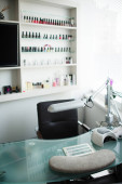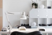 Wnętrze salonu piękności, bez ludzi. Manicure miejsc pracy z profesjonalnych narzędzi. Wnętrze pustego nowoczesnego salonu paznokci. Miejsca pracy dla mistrzów manicure