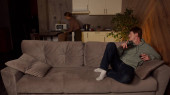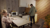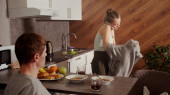Typowy rodzinny poranek, żona rozmawia przez telefon i sprząta kuchnię, mąż na nią patrzy i pije herbatę
