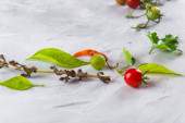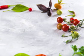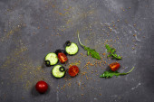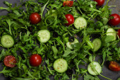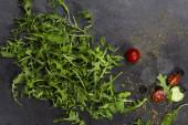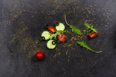 Zdjęcie "Świeże warzywa rukola, pomidor, ogórek, zioła, papryka i oliwki na poziomym ciemnoszarym tle teksturowanym. Widok z góry. Miejsce na tekst," może być wykorzystywane do celów osobistych i komercyjnych zgodnie z warunkami zakupionej licencji Royalty-free. Obraz jest dostępny do pobrania w jakości wysokiej rozdzielczości do 5760x3840.