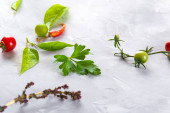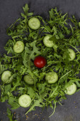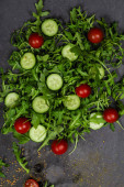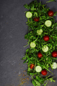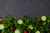 Świeże warzywa rukola, pomidor, ogórek, zioła, papryka i oliwki na poziomym ciemnoszarym tle teksturowanym. Widok z góry. Miejsce na tekst,