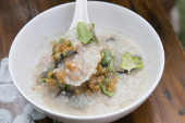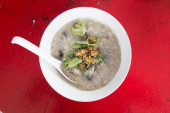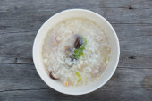 Gotowany ryż z wieprzowiną w białej misce na stole rano.