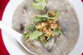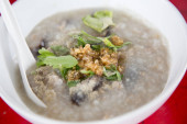 Gotowany ryż z wieprzowiną w białej misce na stole rano.