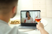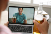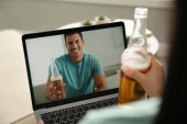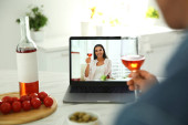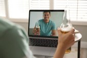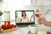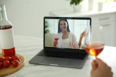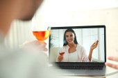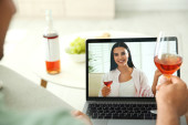 Przyjaciele pijący wino podczas komunikacji przez internetową konferencję wideo w domu. Odległość społeczna podczas pandemii koronawirusowej