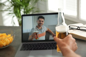 Zdjęcie "Przyjaciele pijący wino podczas komunikacji przez internetową konferencję wideo w domu. Odległość społeczna podczas pandemii koronawirusowej" może być wykorzystywane do celów osobistych i komercyjnych zgodnie z warunkami zakupionej licencji Royalty-free. Obraz jest dostępny do pobrania w jakości wysokiej rozdzielczości do 5760x3840.