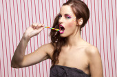 dziewczyna w stroju wieczorowym stosowania makijażu