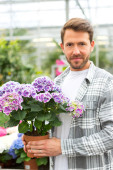 ogrodnik lub pracownika w ogrodzie centrum z boxtrees