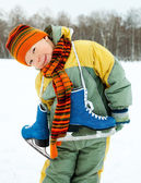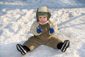 mały chłopiec bawi się śnieżkami; bałwana rzeźbi; mieszkanie śnieg;