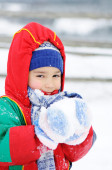 mały chłopiec bawi się śnieżkami; bałwana rzeźbi; mieszkanie śnieg;