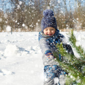 mały chłopiec bawi się śnieżkami; bałwana rzeźbi; mieszkanie śnieg;