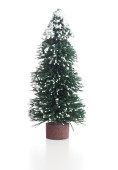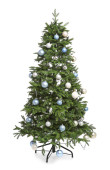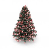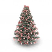 Ozdobiona choinka z czerwoną spódnicą na białym tle