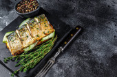 Stek rybny halibuta z rozmarynem. Czarne tło. Widok z góry.