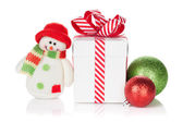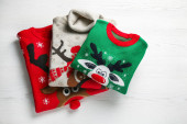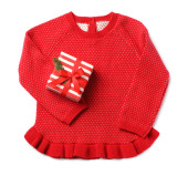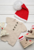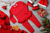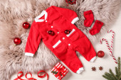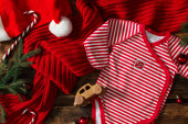 Czerwone składane ubrania dla niemowląt i dekoracje świąteczne na białym tle, widok z góry