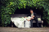 ślub. świeżo poślubiona para piękny pocałunek na moście