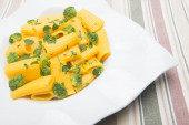 Selektywne skupienie i zbliżenie widelca gospodarstwa makaron i warzywa na nieostry talerz sałatki makaronowej. Zdrowa żywność i koncepcja makaronu.