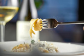 Zdjęcie "Selektywne skupienie świeżo ugotowanego makaronu z serem na widelcu trzymanym ręką nad talerzem z nieostrym kieliszkiem wina. Koncepcja stylu życia." może być wykorzystywane do celów osobistych i komercyjnych zgodnie z warunkami zakupionej licencji Royalty-free. Obraz jest dostępny do pobrania w jakości wysokiej rozdzielczości do 5760x3840.