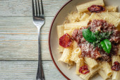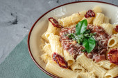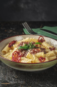 Zdjęcie "Talerz pysznego apetycznego wegetariańskiego makaronu z sosem pomidorowym, pomidorami, serem i bazylią na czarnym stole. Widok z góry." może być wykorzystywane do celów osobistych i komercyjnych zgodnie z warunkami zakupionej licencji Royalty-free. Obraz jest dostępny do pobrania w jakości wysokiej rozdzielczości do 5760x3840.