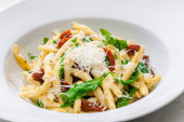 Talerz pysznego apetycznego wegetariańskiego makaronu z sosem pomidorowym, pomidorami, serem i bazylią na czarnym stole.