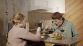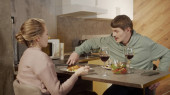 Młoda para kładzie jedzenie na talerzach, dbają o siebie podczas kolacji w kuchni w ich mieszkaniu