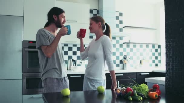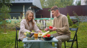 Szczęśliwa rodzina je lunch w słonecznej kuchni swojego nowego domu. Talerz zupy, ciasta, owoce na stole. Komunikacja między mężem a żoną.
