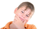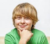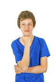 przystojny chłopiec w czerwonej koszuli trzyma rękę na brodzie
