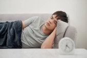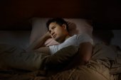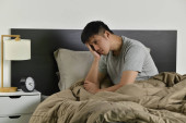 Młody człowiek w depresji cierpiący na bezsenność leżący w łóżku
