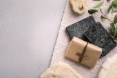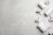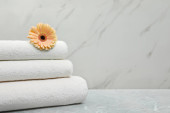 walcowane biały ręcznik do leczenia spa umieścić na białej marmurowej podłodze
