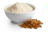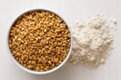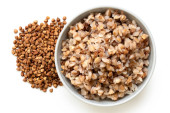 Mąka gryczana w białej ceramicznej misce obok surowej zielonej gryki wyizolowanej na białym. Widok z góry.