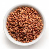 Surowa zielona gryka w czarnej ceramicznej misce odizolowana na biało. Kąt wysoki.