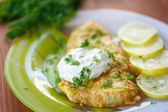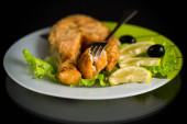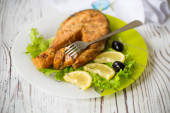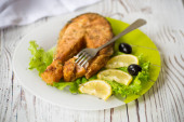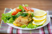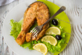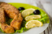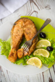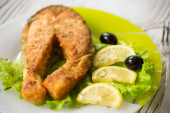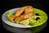 kawałek smażonego łososia w talerzu z cytryną i ziołami
