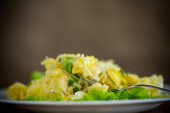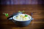 ryż lekki gotowany z warzywami i mięsem w ceramicznej misce na drewnianym stole