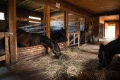 Malownicze ujęcie drewnianej stajni z pięknym światłem dziennym. Kasztany jedzą siano po przejażdżce z jeźdźcami.