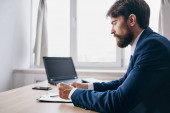 Zdjęcie "Mężczyzna w klasycznym garniturze siedzi przy stole i otwartym oknie w biurze laptopa." może być wykorzystywane do celów osobistych i komercyjnych zgodnie z warunkami zakupionej licencji Royalty-free. Obraz jest dostępny do pobrania w jakości wysokiej rozdzielczości do 5760x3840.