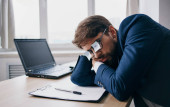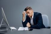 Mężczyzna w klasycznym garniturze siedzi przy stole i otwartym oknie w biurze laptopa.